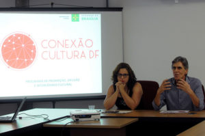 Secretário de Cultura, Guilherme Reis, e subsecretária de Políticas de Desenvolvimento e Promoção Cultural, Mariana Soares no lançamento do programa Conexão Cultura DF. Foto: Foto: Gabriel Jabur/Agência Brasília